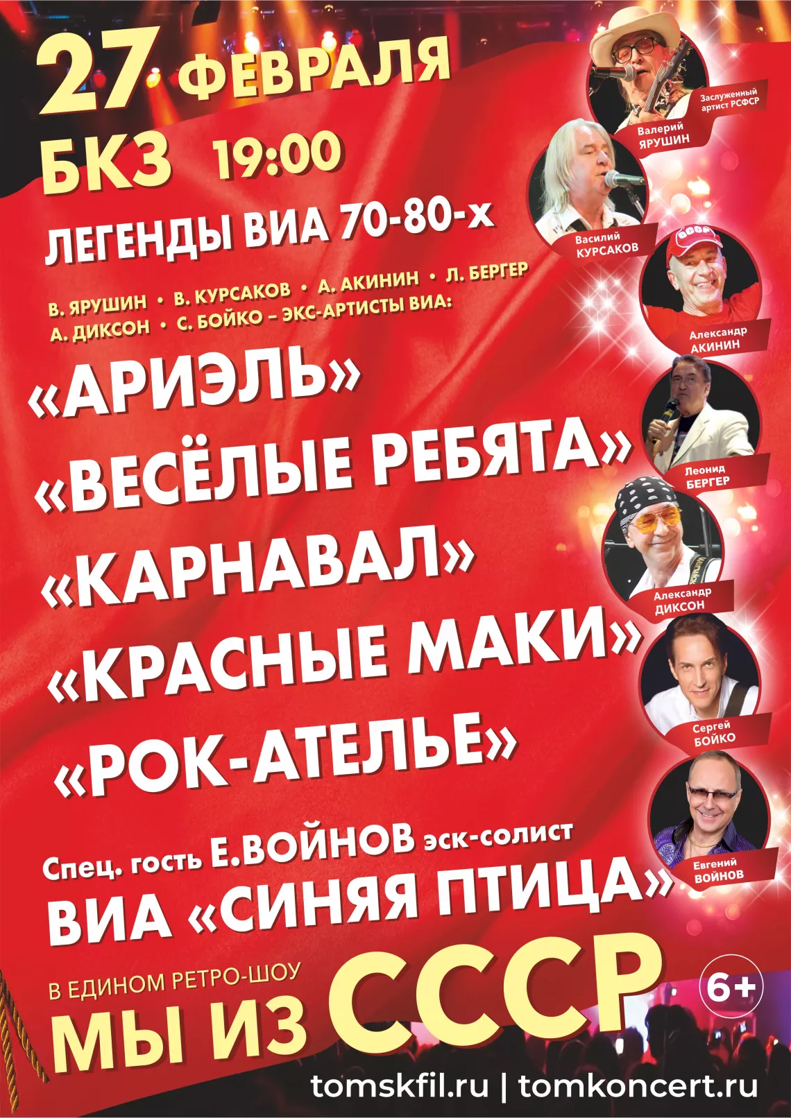 Уважаемые меломаны и ценители советской музыки, готовьтесь пережить незабываемый вечер в сопровождении лучших исполнителей своего поколения! Мы представляем вам юбилейный тур легендарных советских артистов "Легенды ВИА 70-80х.Мы из СССР"!
